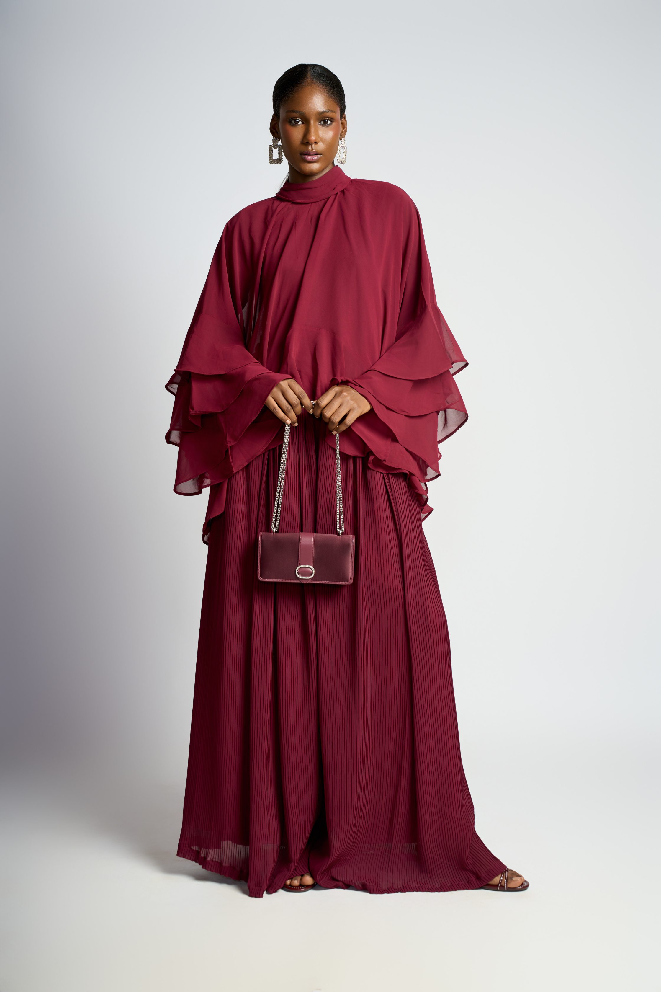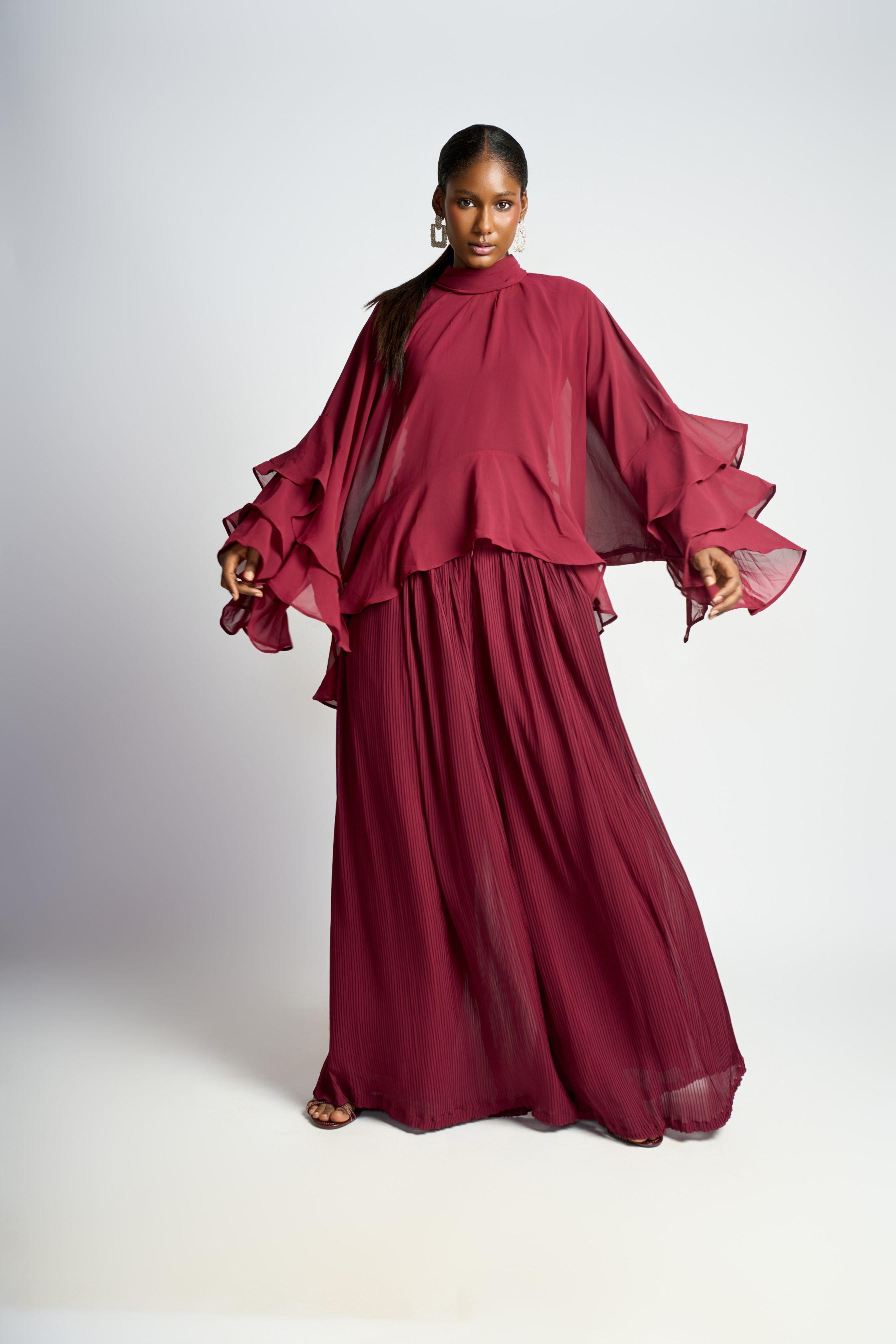 Ensemble fluide composé d’un haut vaporeux à volants superposés et d’un pantalon large plissé au tombé élégant. Le monochrome bordeaux crée une silhouette allongée, moderne et sophistiquée. Un look puissant, confortable et couture.