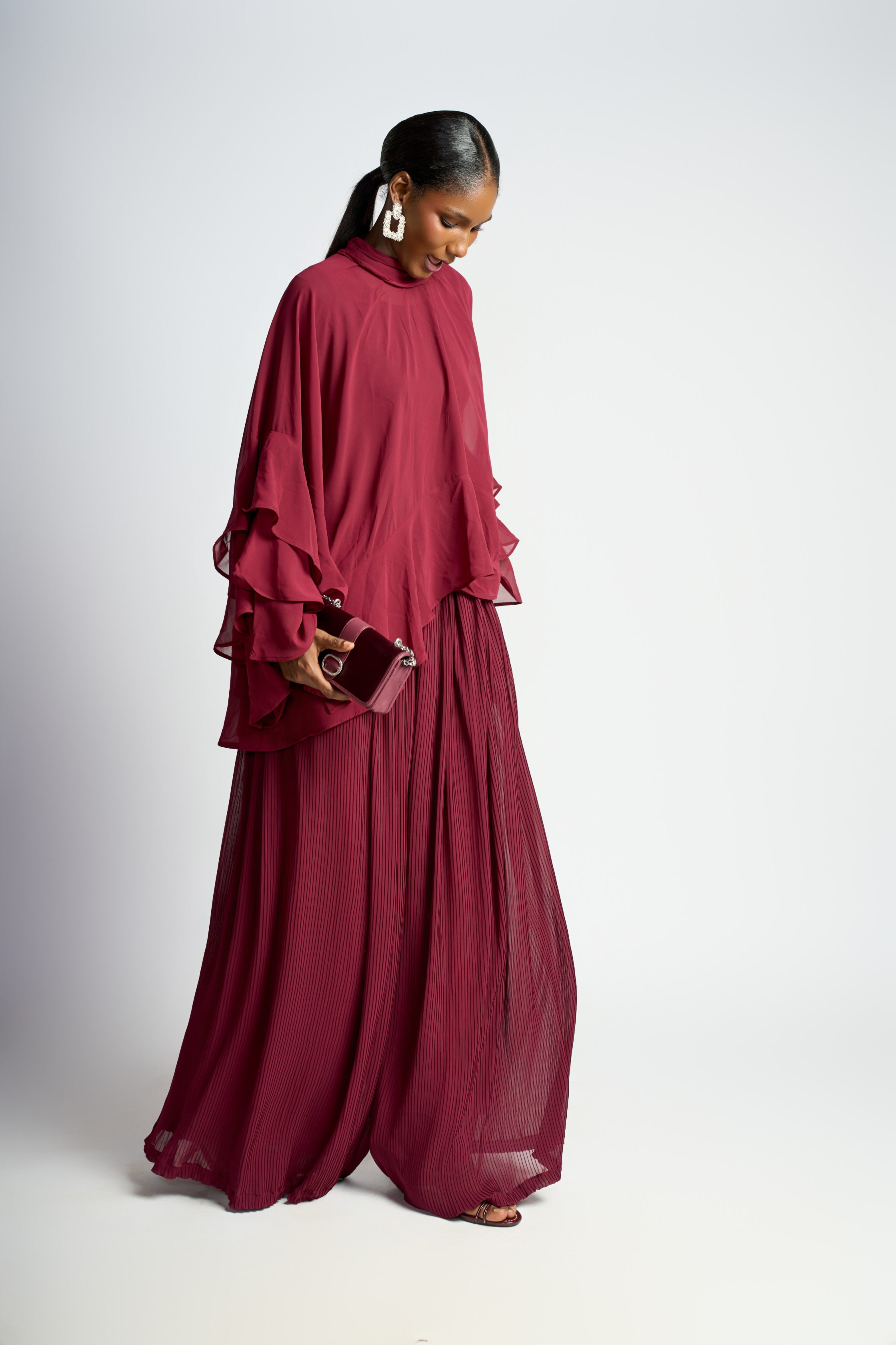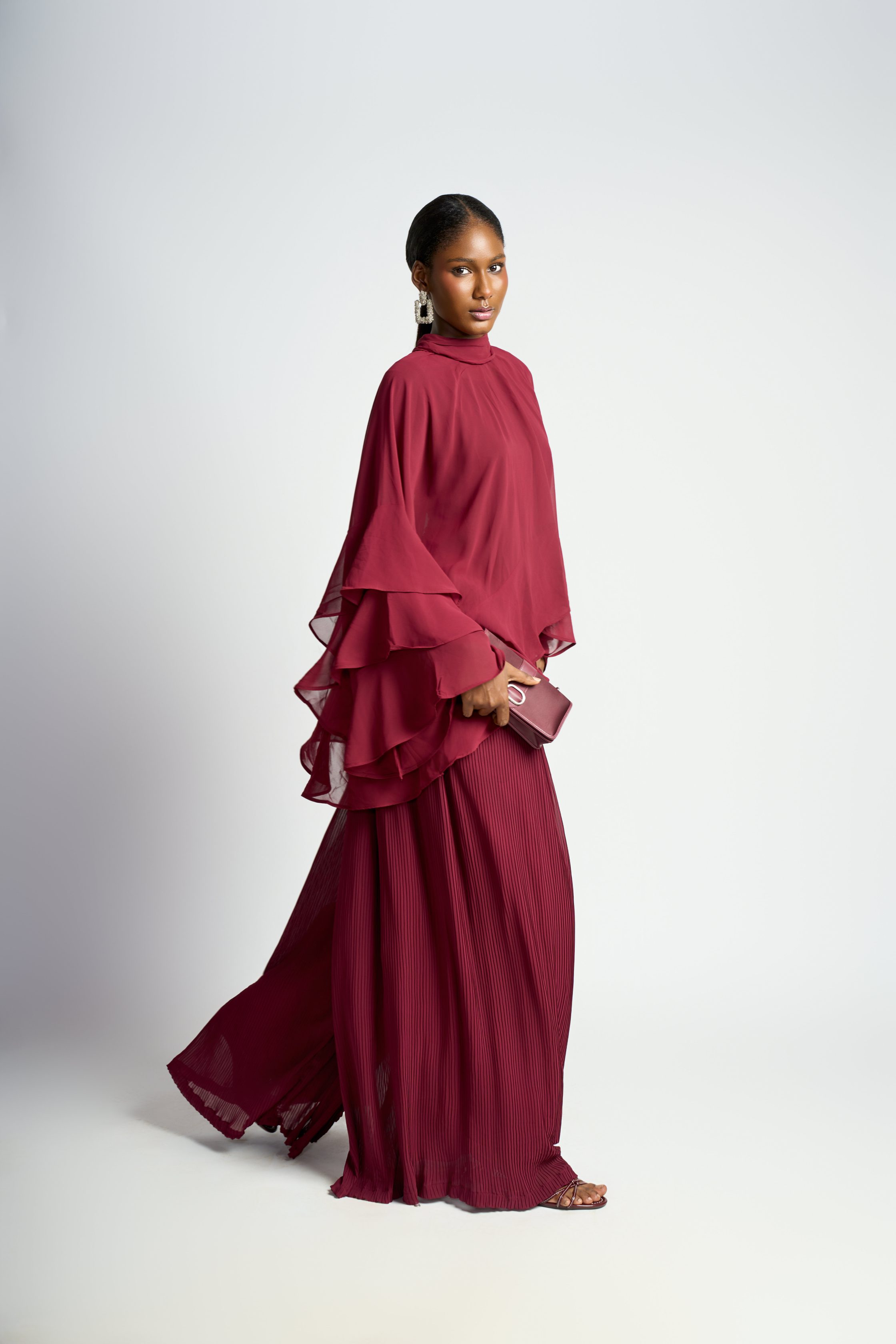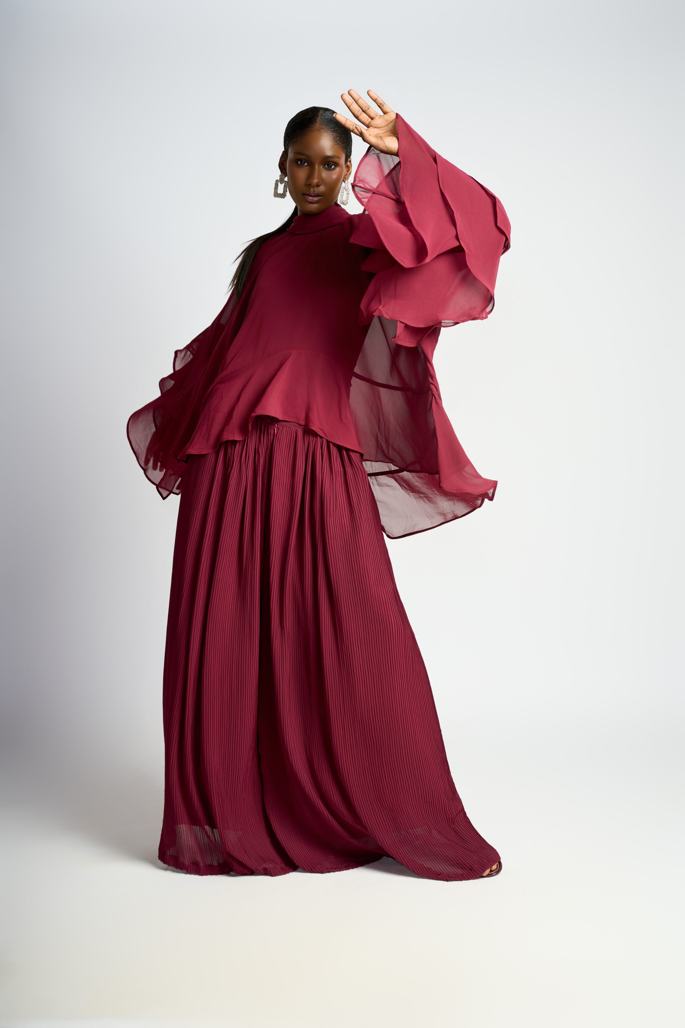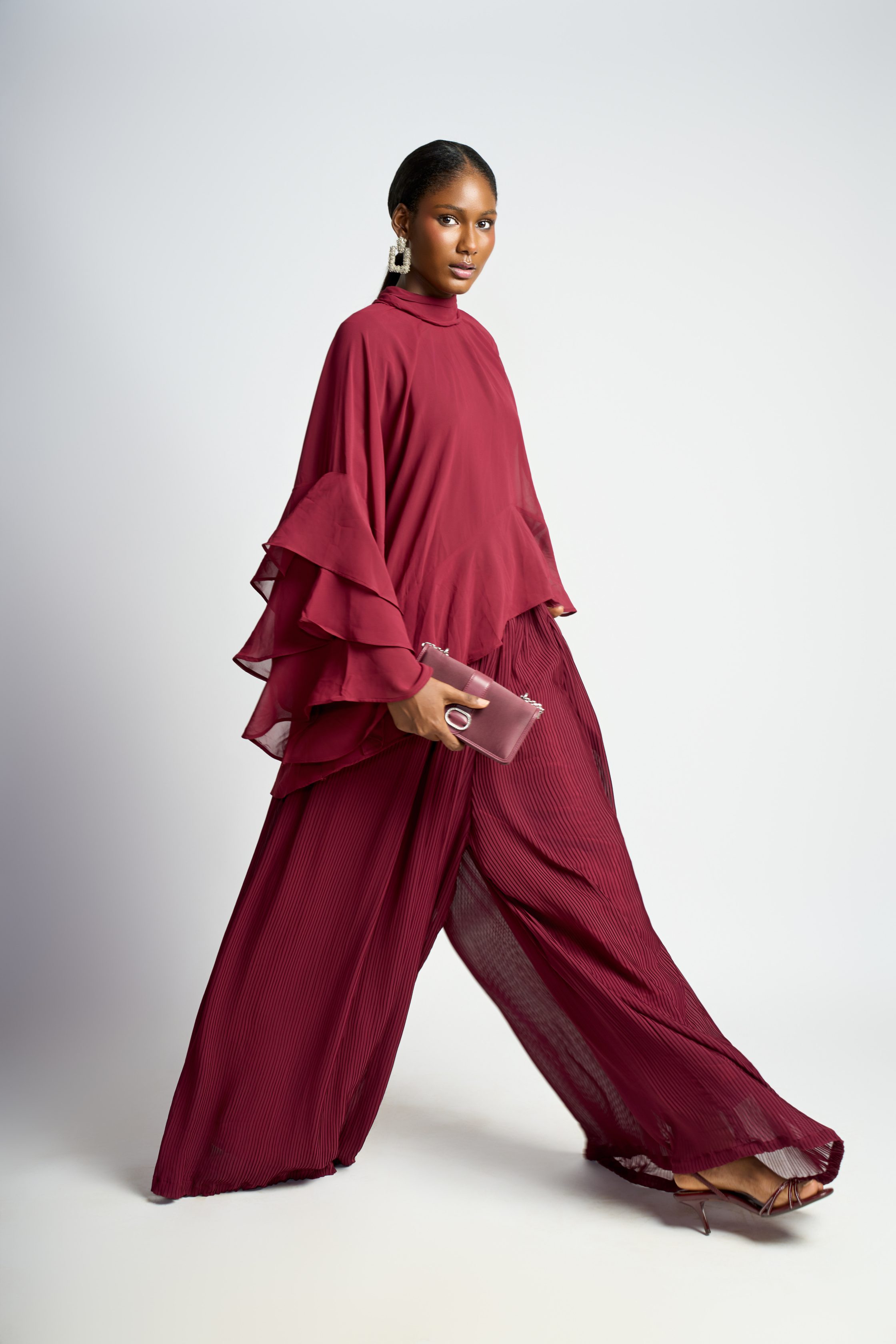 Ensemble fluide bordeaux : haut vaporeux à volants et pantalon large plissé. Silhouette allongée, moderne et sophistiquée.