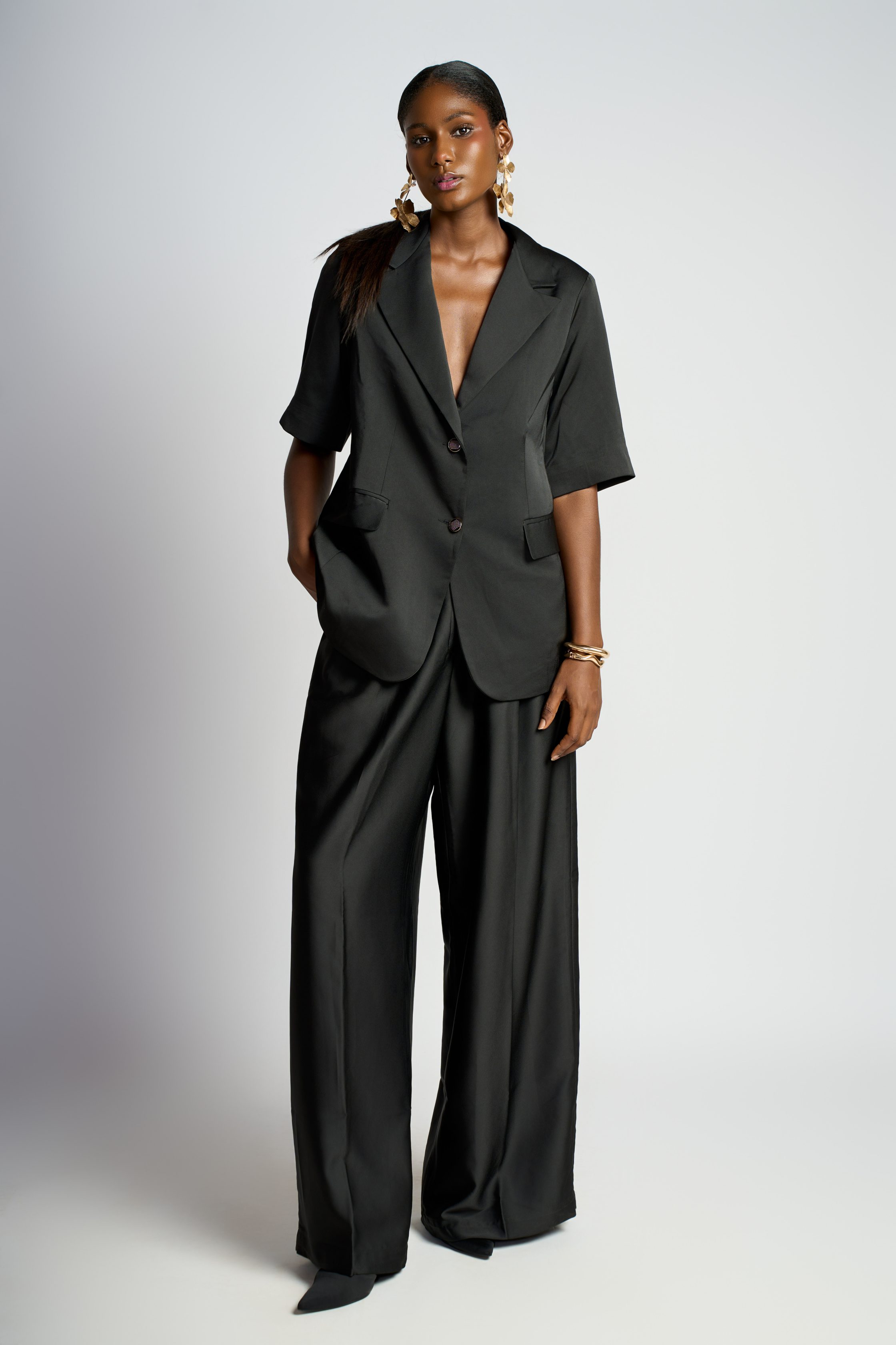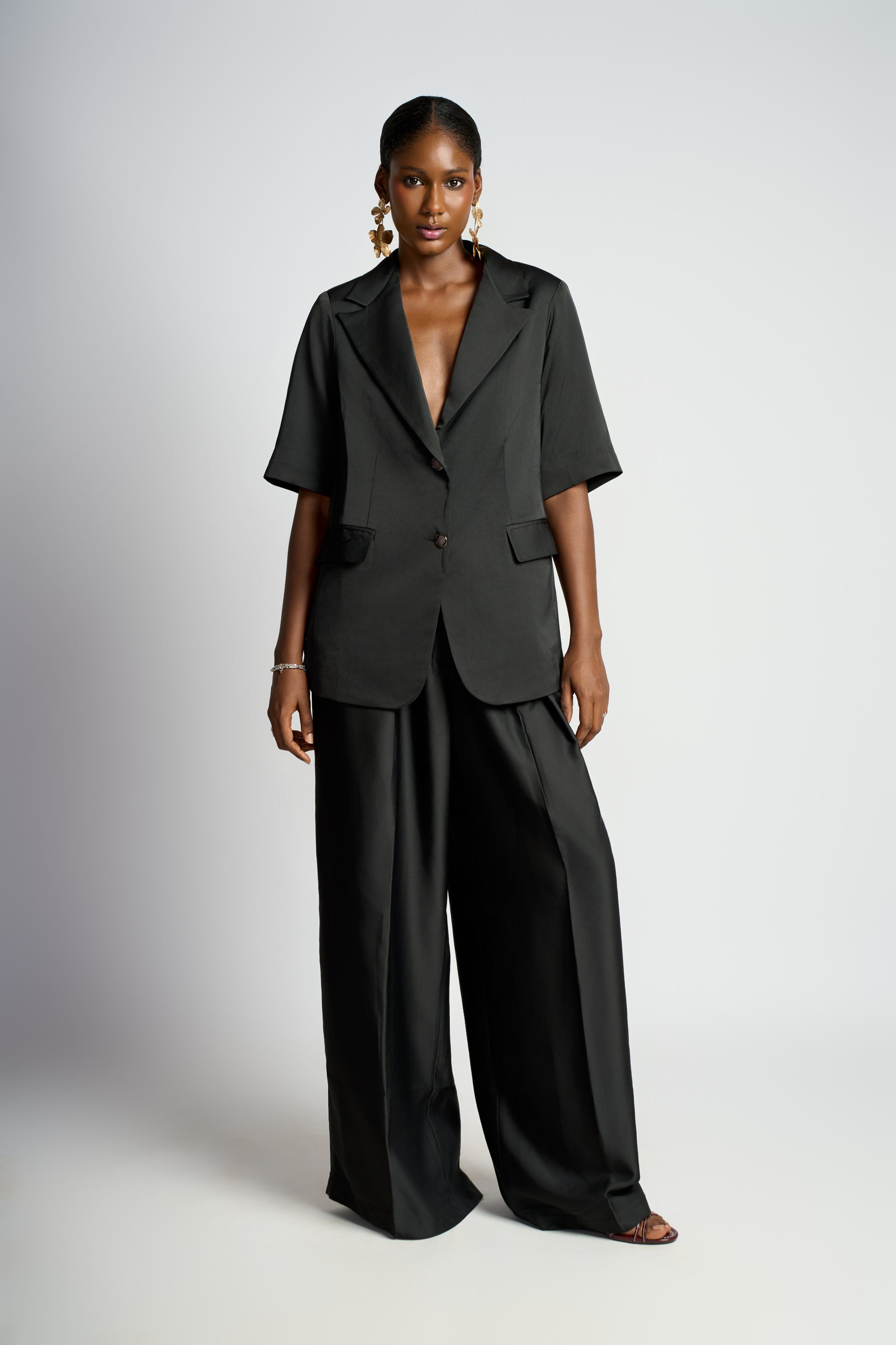 L’ensemble Malaika joue sur l’équilibre entre sophistication et modernité. Le blazer en soie, à manches courtes, offre une silhouette légère et ultra-contemporaine. La soie apporte un éclat subtil et un tombé raffiné, tandis que les manches courtes créent une attitude plus affirmée, presque sculpturale.
