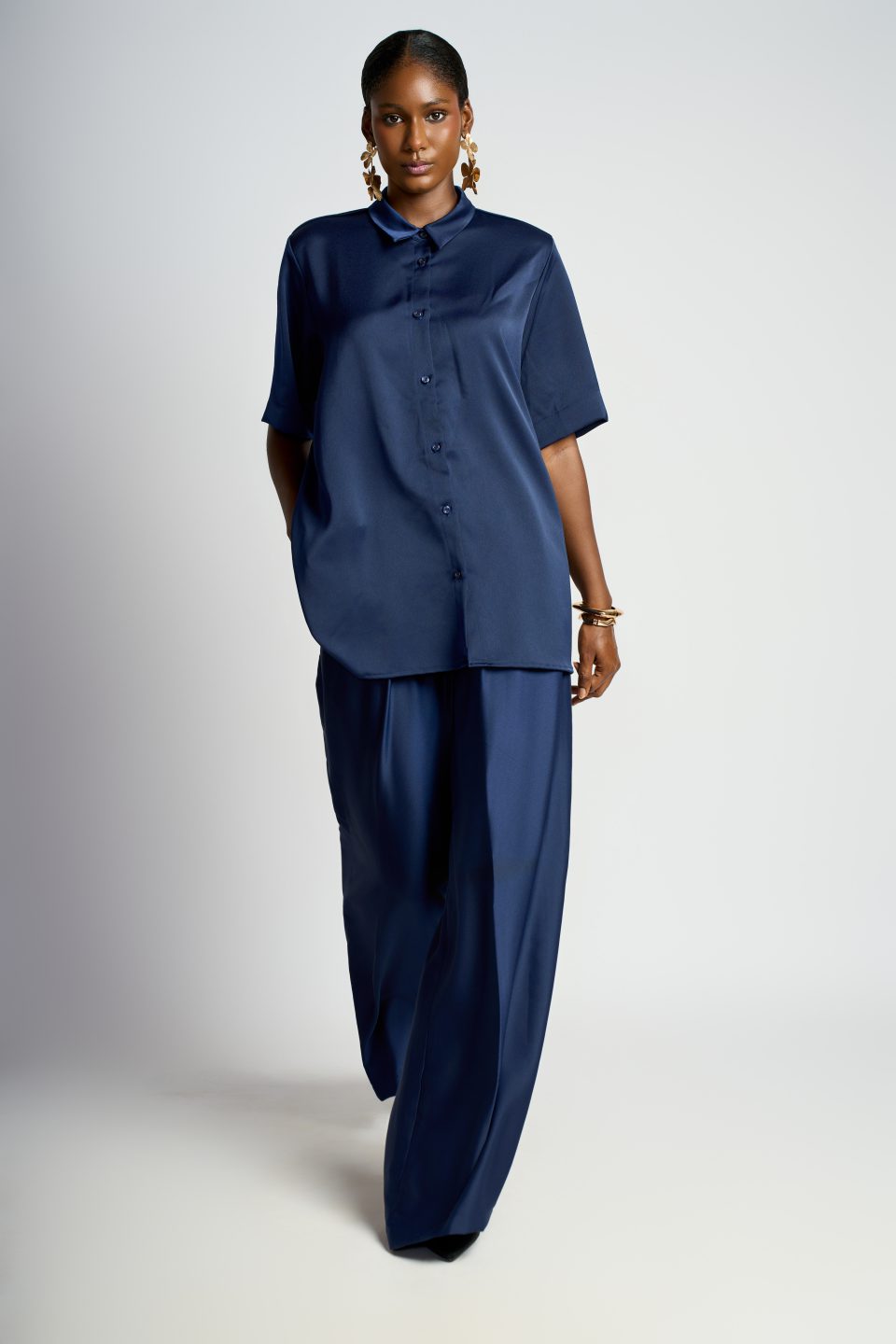 Le pantalon est réalisé dans un tissu fluide au tombé impeccable, avec une ligne épurée, pensée pour allonger la jambe et équilibrer le volume de la veste. Une tenue pensée pour une femme affirmée, minimaliste, mais résolument couture.